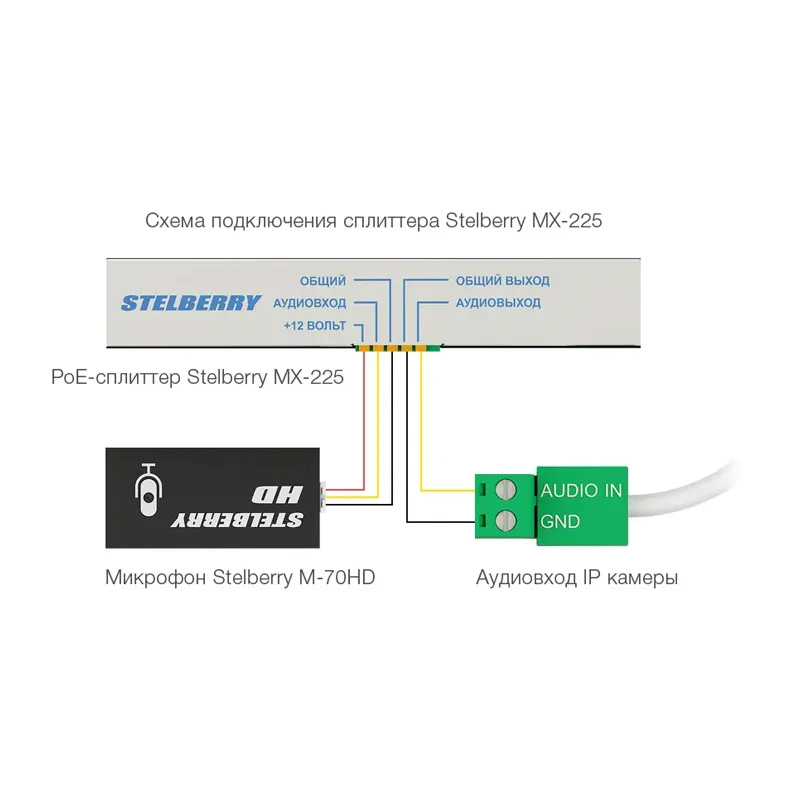 STELBERRY MX-225 является очень удобным и универсальным решением для питания активных микрофонов от PoE питания IP-камер. Сплиттер ставится в разрез Ethernet-кабеля, идущего к IP-камере и преобразует 48 Вольт PoE-питания в 12 Вольт, при этом IP камера продолжает питаться по PoE.