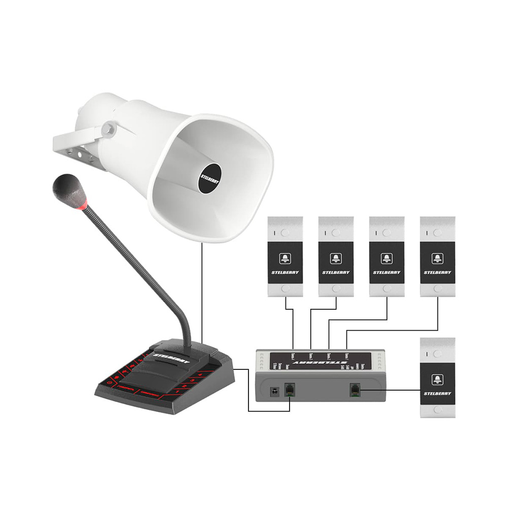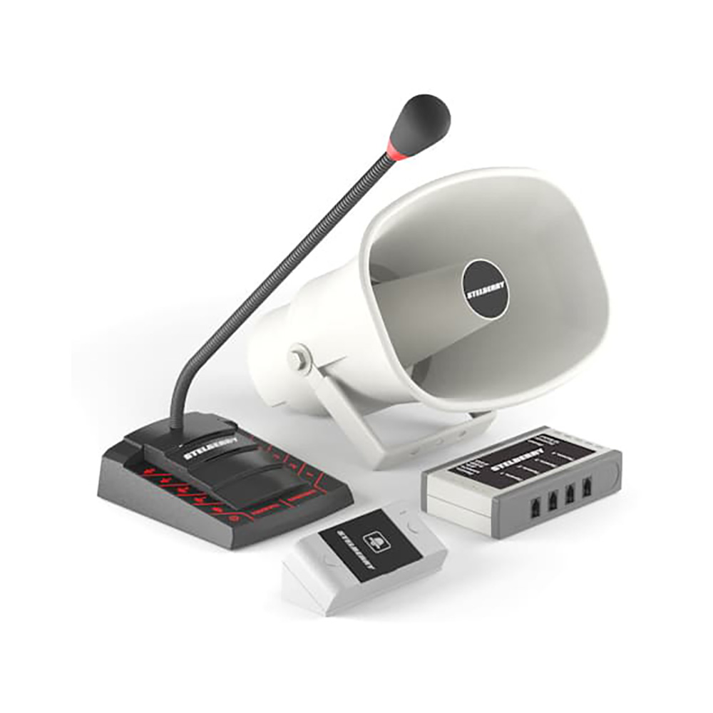 Комплект 4+1-канального переговорного устройства клиент-кассир для АЗС с системой громкого оповещения, функцией "симплекс", функцией "вызов", встроенным усилителем, рупором на 15 Ватт и выходом для записи переговоров. Рупор идёт в комплекте с 15 метрами кабеля. Панель клиента, угловое крепление панели и блоки питания в комплекте.