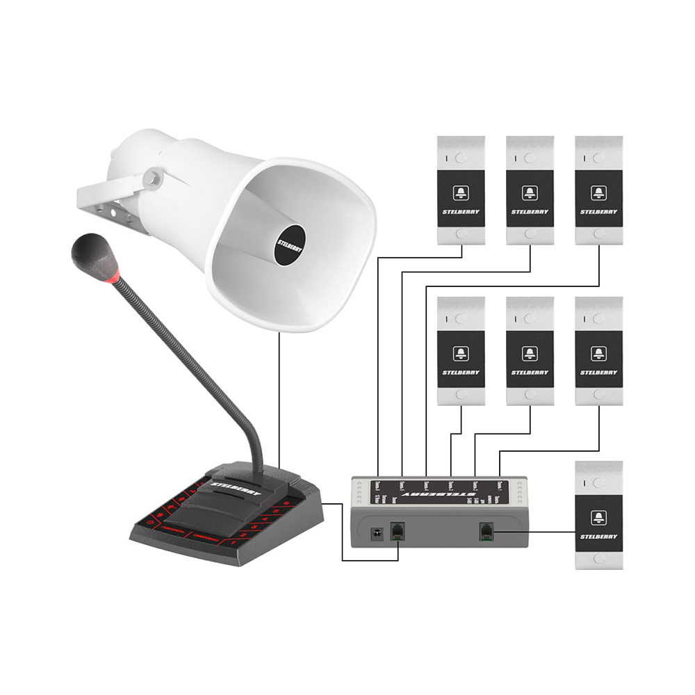 Комплект 6+1-канального переговорного устройства клиент-кассир для АЗС с системой громкого оповещения, функцией "симплекс", функцией "вызов", встроенным усилителем, рупором на 15 Ватт и выходом для записи переговоров. Рупор идёт в комплекте с 15 метрами кабеля. Панель клиента, угловое крепление панели и блоки питания в комплекте.