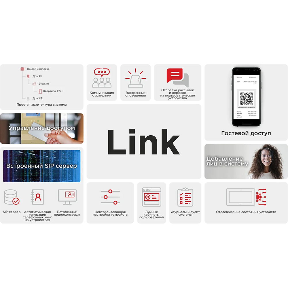 LINK PLATFORM — экосистема, позволяющая в кратчайшие сроки интегрировать современные IP решения управления доступом в любые (в том числе уже установленные) системы домофонии. Технические преимущества версии LINK BUSINESS PLATFORM: масштабируемый SIP-сервер, полноценное рабочее место консьержа, индивидуальное мобильное приложение.