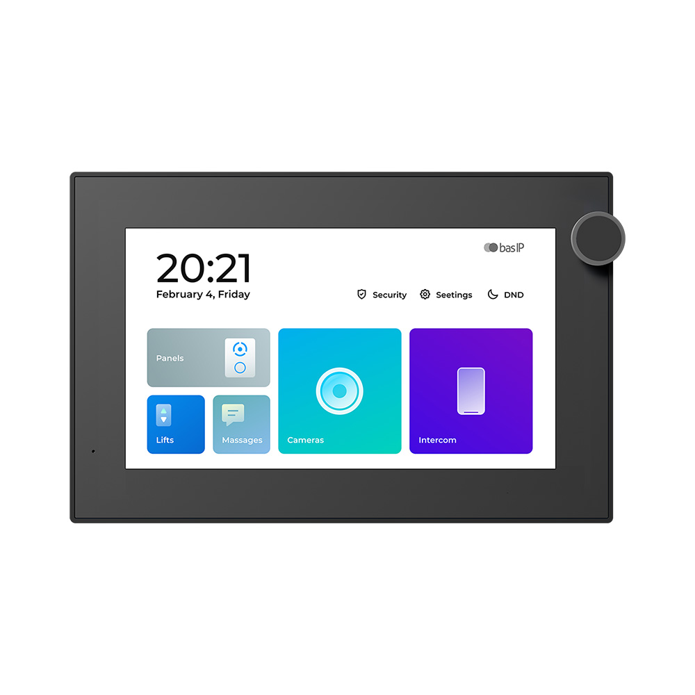 7 дюймовый IP видеодомофон с настенным горизонтальным и вертикальным монтажом, возможностью управления лифтом, выводом сообщений от управляющей компании, PoE, подключением 8 камер, памятью для фото/видео и автоответчиком. ОС — Linux.