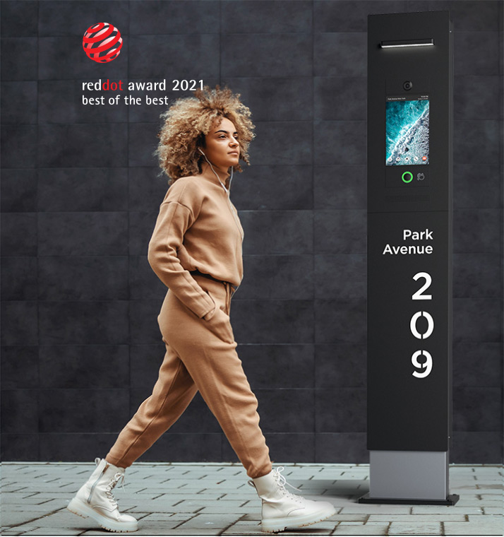 Obelisk выполнен как монолитная композиция, выглядит как пьедестал, имеет интегрированную внешнюю систему интеркома и использует в работе искусственный интеллект. Именно сочетание технологий и оригинального внешнего вида помогло Obelisk одержать победу в Red Dot «Design Concept 2021».