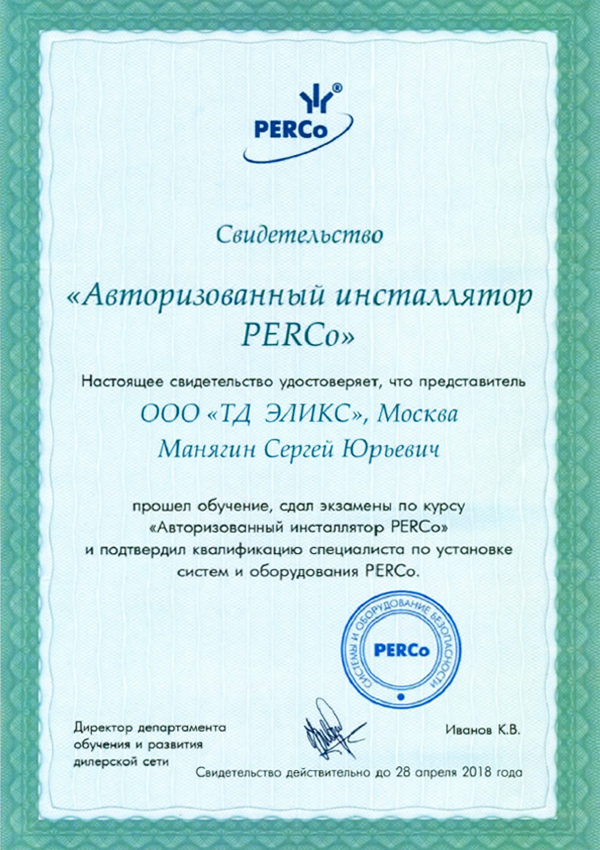Наши сотрудники Варсанович Иван Владимирович и Манягин Сергей Юрьевич прошли обучение в PERCo и успешно сдали квалификационные экзамены по программе «Авторизованный инсталлятор».
