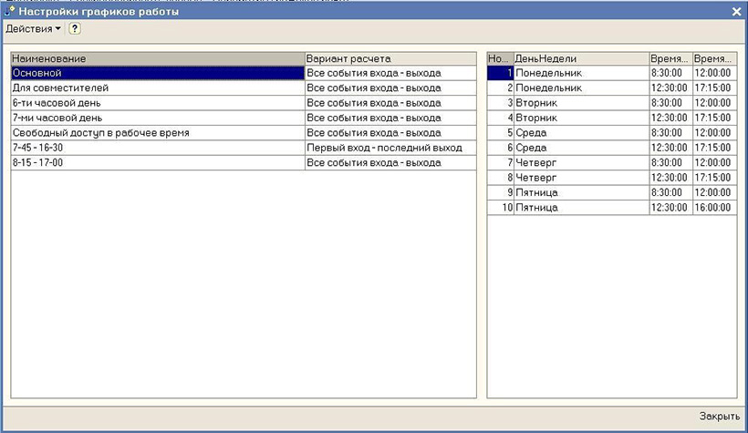 - Учет рабочего времени сотрудников, назначение рабочих графиков.